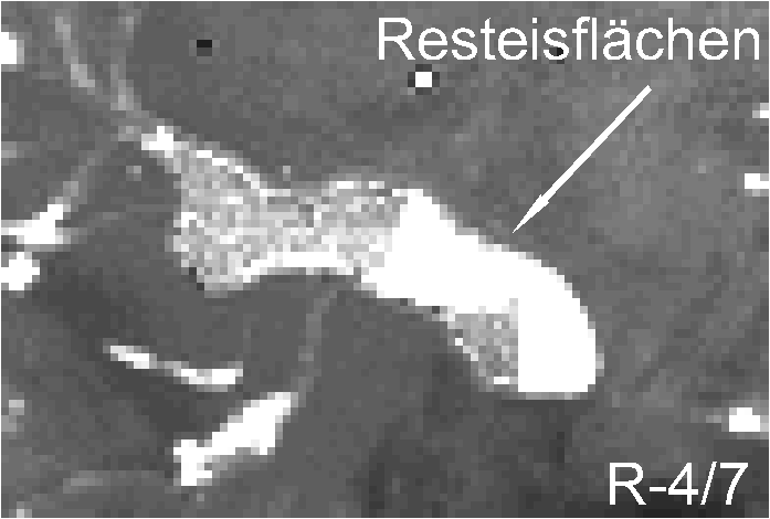 Abbildung 12: IR-Ratio der Kanäle TM-4/TM-7 (R-4/7) für den Bereich eines Schmelzwassersees NE' der Caldera mit den deutlich ausgeprägten Resteisflächen.